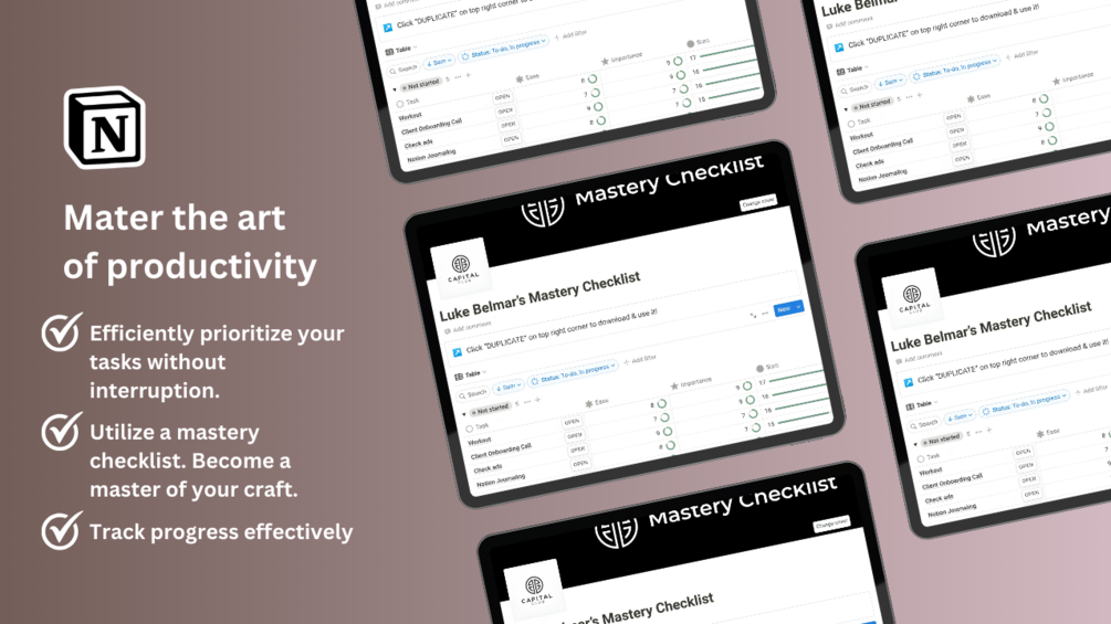 Introducing the Mastery Checklist Notion template – your key to unlocking peak productivity and achieving mastery in any endeavor! Seamlessly organize your goals, track progress, and elevate your skills with this meticulously crafted template. From detailed task breakdowns to insightful progress analytics, empower yourself to conquer challenges and master your craft. Elevate your journey towards excellence.