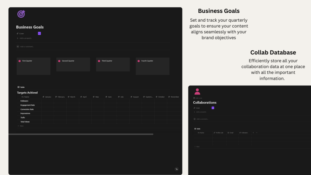 ✨ Quarterly Goals: Set and track your Quarterly Goals to ensure your content aligns seamlessly with your business objectives
