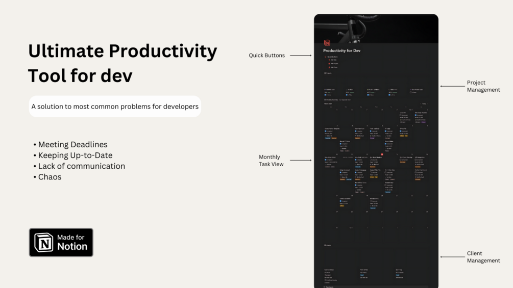 Stop juggling tools and reclaim your focus with this all-in-one Notion template designed specifically for developers.